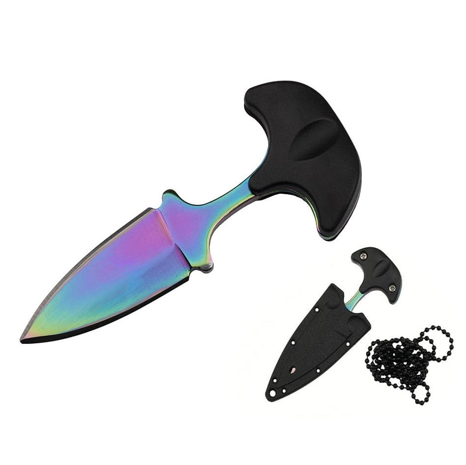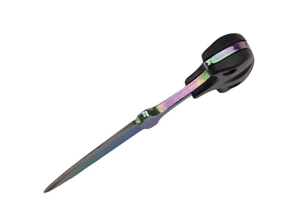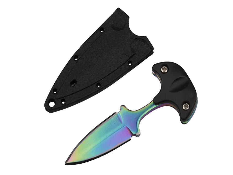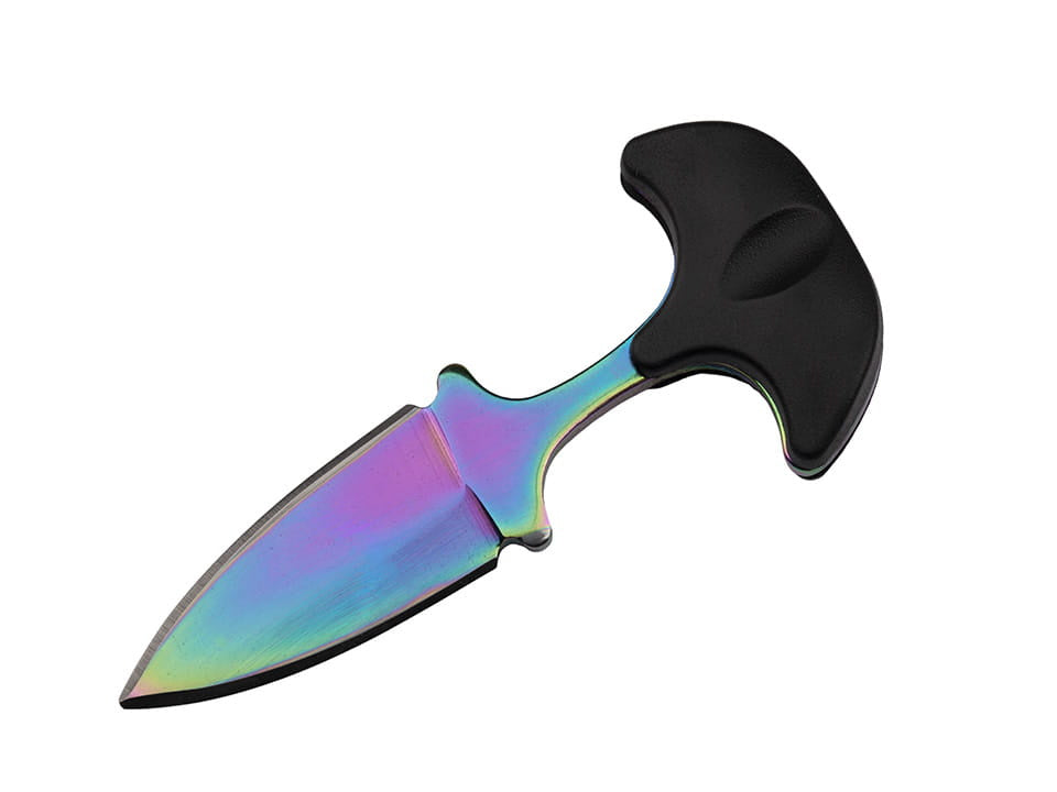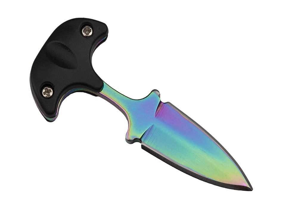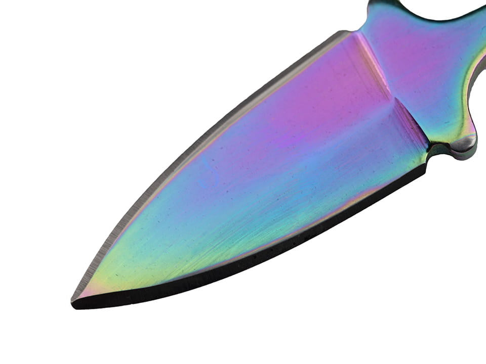 Akį traukiančios vaivorykštės spalvos taktinis peilis.