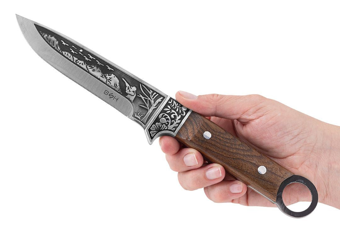 Gausiai dekoruotas medžioklinis peilis visiems medžioklės kultūros ir tradicijų gerbėjams.