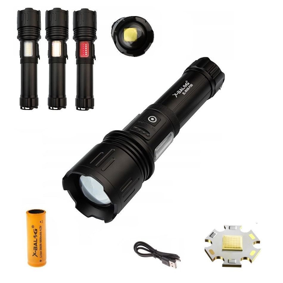 Komplektą sudaro: X-BALOG BL-W406-P360 L-115 žibintuvėlis, 26650 ličio jonų akumuliatorius, USB laidas, dėžutė.